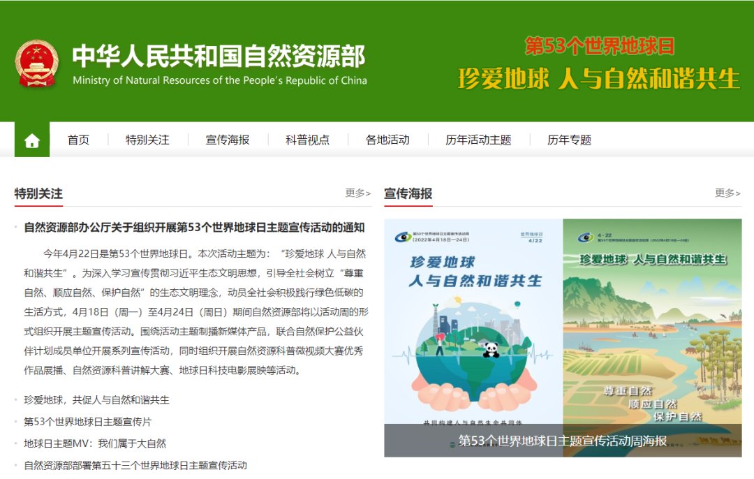 今年4月22日是第53个世界地球日。本次活动主题为:“珍爱地球 人与自然和谐共生”。为深入学习宣传贯彻习近平生态文明思想,引导全社会树立“尊重自然、顺应自然、保护自然”的生态文明理念,动员全社会积极践行绿色低碳的生活方式,4月18日(周一)至4月24日(周日)期间自然资源部将以活动周的形式组织开展主题宣传活动。围绕活动主题制播新媒体产品,联合自然保护公益伙伴计划成员单位开展系列宣传活动,同时组织开展自然资源科普微视频大赛优秀作品展播、自然资源科普讲解大赛、地球日科技电影展映等活动。