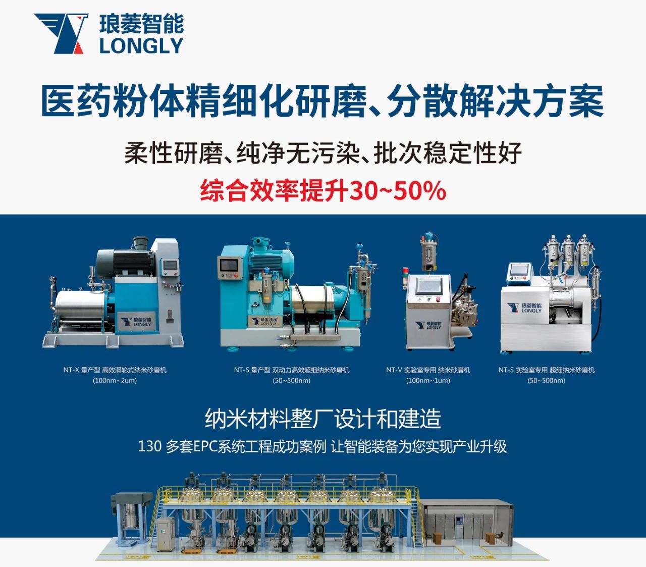 琅菱智能专门为医药粉体制备研发的精细化研磨、分散解决方案,展示了智能化单机设备与纳米材料整厂设计和建造在该领域的优势:柔性研磨更好的比表面积呈现、纯净无污染、批次稳定性好等。