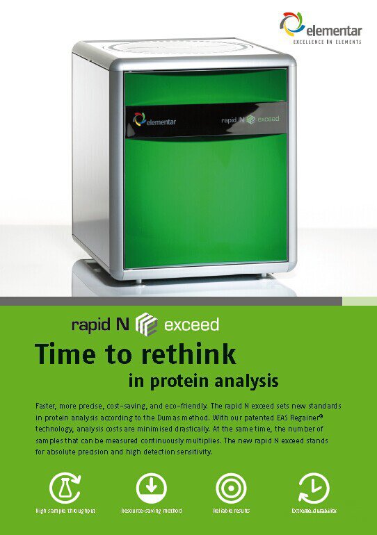 今年我们庆祝德国元素elementar 的杜马斯氮分析仪50周年,建立在五十年的经验及不断研发的基础上,我们研发了最具革新的最经济的氮/蛋白质分析仪(杜马斯法):Rapid N exceed