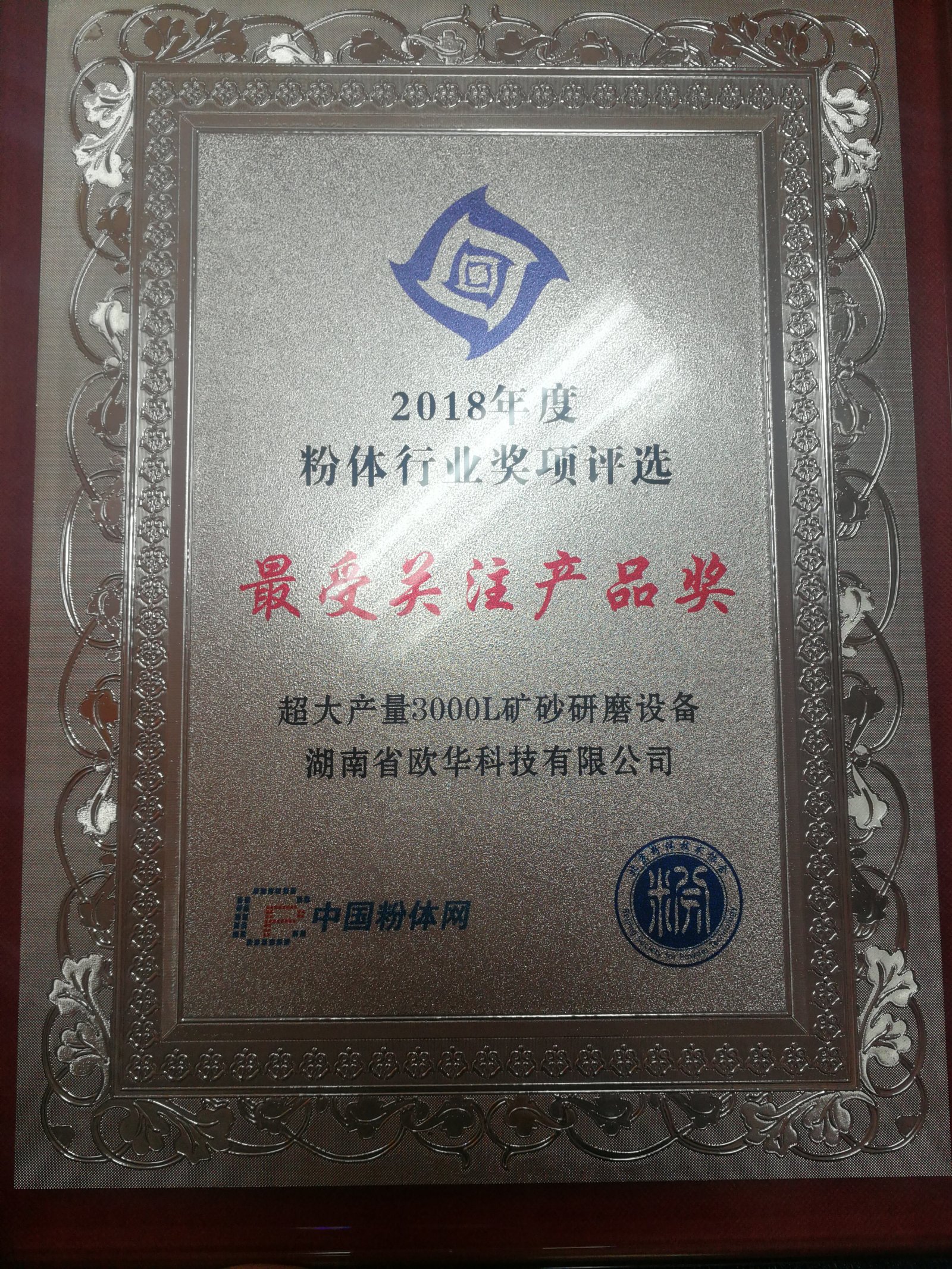 日前,2018粉体行业年度奖项评选揭晓,湖南省欧华科技有限公司名牌产品“超大产量3000L矿砂研磨设备”被评选为粉体行业“最受关注产品”。