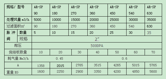 三,AR-SP烧结板除尘器的规格