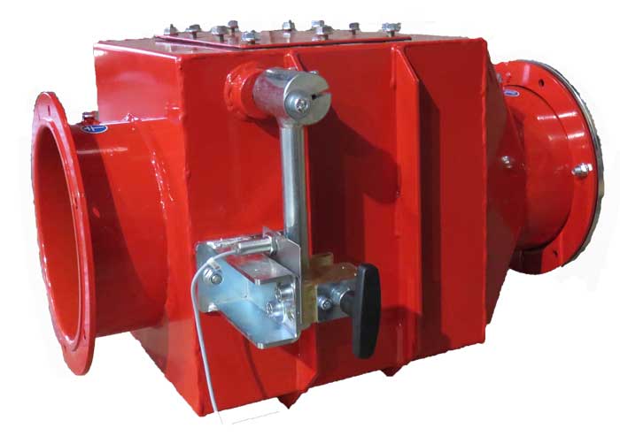 自锁机构:翻板式隔爆阀必须配带有自锁或锁止机构,以防止隔爆阀在粉尘爆燃过程中翻板重新开启。如果没有自锁机构,粉尘爆燃产生的压力波可能会造成翻板在关闭过程中碰撞到阀体时重新开启或颤动。这可能会造成爆炸火焰和未完全燃烧的粉尘穿过翻板,从而引爆上游管道内的粉尘,导致“二次爆炸”的产生。