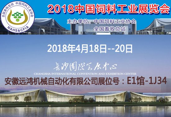 2018中国饲料工业展览会将于2018年4月18日至4月20日在湖南长沙国际会展中心举行,安徽远鸿机械自动化有限公司应邀参展,展位号:E1馆-1J34,诚邀您莅临指导!