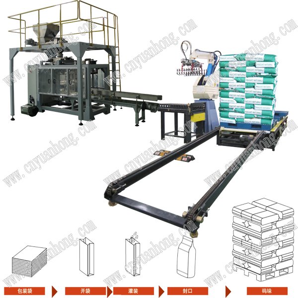 刚玉质耐火材料全自动包装码垛线机组具有自动称量、自动上袋、自动填充、自动送包、自动封口等功能。