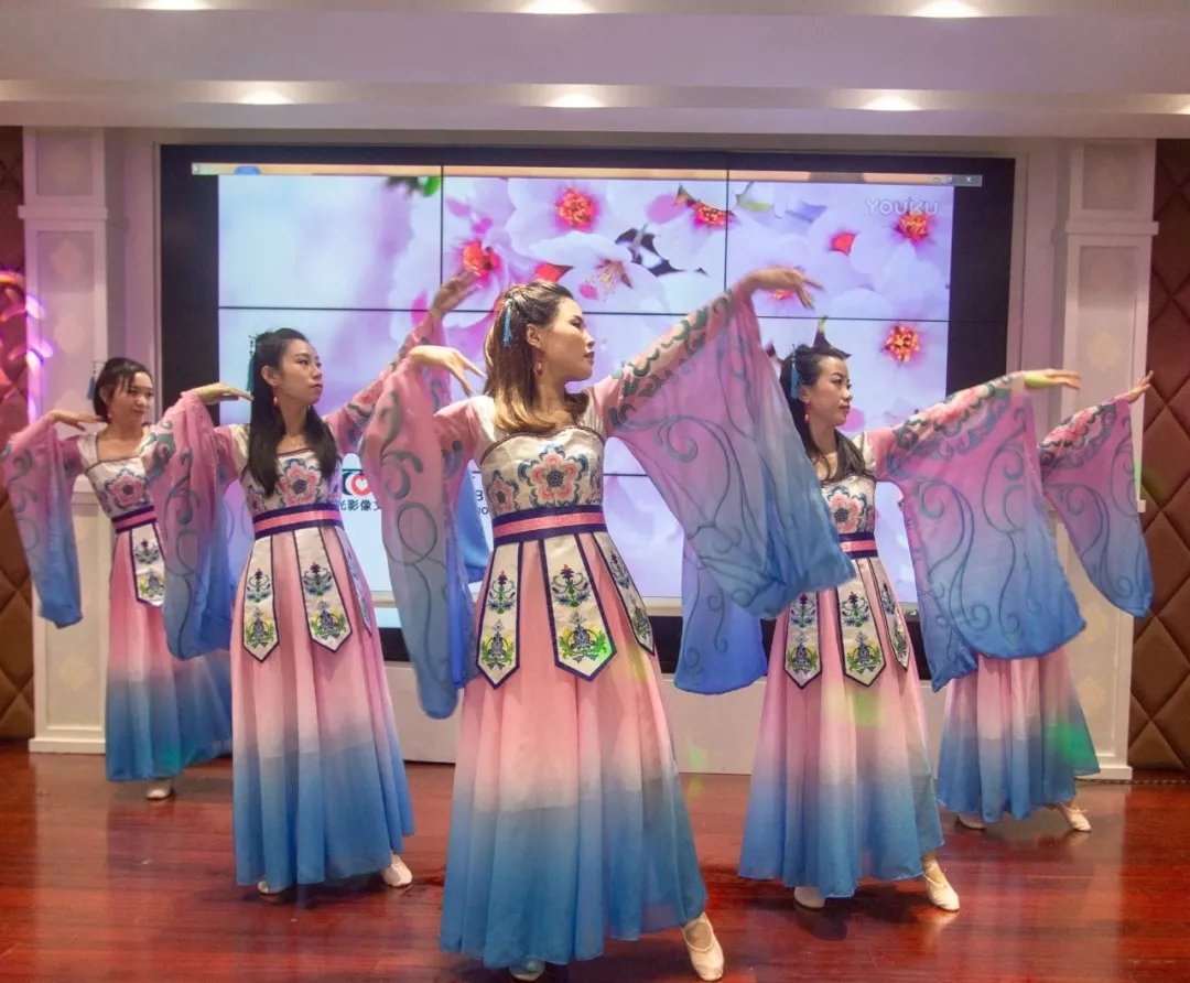 各部门美女联合表演的舞蹈《半壶砂》,以千里桃花徐徐飘落为背景,飘逸流畅的旋律、清雅从容的吟唱,无不蕴藏着一股超凡脱尘的净心能量,让大家看得如痴如醉。正所谓:闻香一盏茶,兜揽半壶纱,清韵挽飘逸,养心自成华。