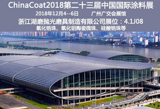 ChinaCoat2018第二十三届中国国际涂料展将移师广州,定于2018年12月4--6日在广州广交会展馆举行。浙江湖磨抛光磨具制造有限公司携氧化锆珠、氧化铝陶瓷微珠、硅酸锆珠等亮相,期待与您相约湖磨展台4.1J08。