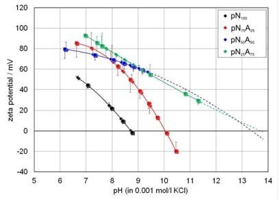 抗菌活性对不同微生物的抑制可由含有小数量的pN25A75 和 pN50A50及Zeta电位测量得到的IEPs的相关性观察到。