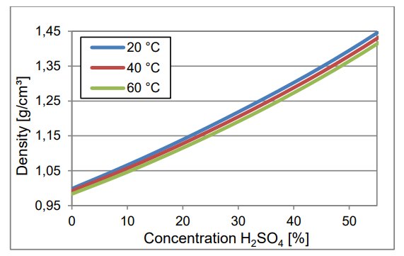 在硫酸溶液中,密度测量非常适合测定高达90%的H2SO4浓度。在铅酸蓄电池生产中,0%至55% (1.4453 g/cm³ @ 20°C) 的浓度范围很重要,密度与硫酸浓度具有陡峭且几乎呈线性的相关性。