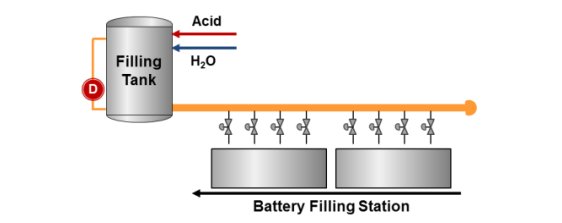 中小型工厂用罐中储存各种所需浓度的硫酸。大型工厂可以进行两阶段稀释过程。第一步是稀释并储存中等浓度的H2SO4,第二步是在加注站进行最终稀释(如上图所示 )。产品转换,即推出新类型或尺寸的蓄电池,可能引起加注站的浓度变化。如果仅由实验室浓度测量提供支持,则调整灌装罐的浓度可能需要长达40分钟。安东帕的在线密度传感器L-Dens 3300 可以协助实现自动控制浓度变化,从而将停机时间缩短到手动控制变化所需时间的一小部分。