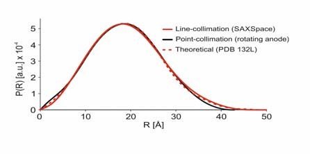 在这个研究中,将实验室SAXS仪器线准直(封闭靶SAXSpace系统)与点准直(旋转阳极靶系统)测量的lysozyme蛋白溶液(5 mg/ml)的散射曲线进行比较。两个实验的曝光时间和qmin是一样的。