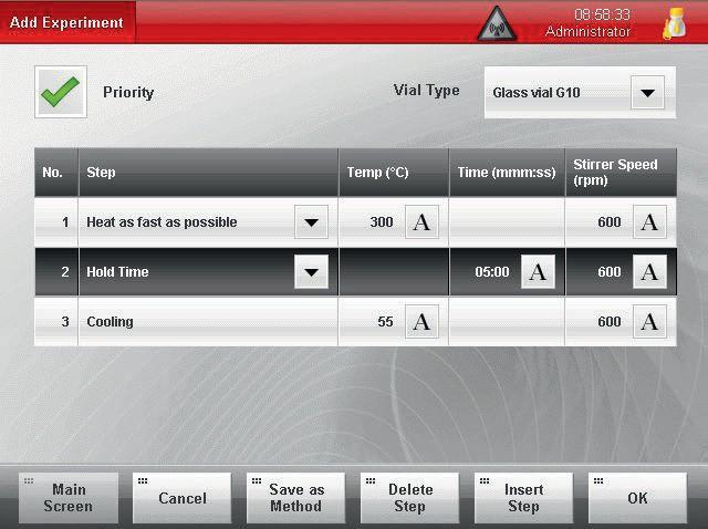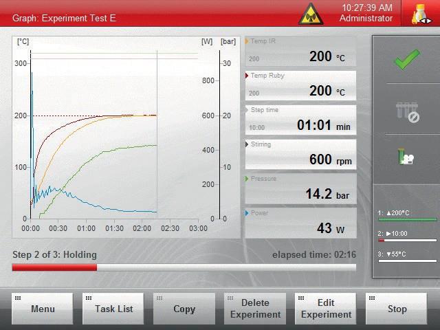 将密封好的反应管放入微波腔体后,就可以设置需要的反应条件了。之后,就可以通过点击“Start”来开始程序了。此外在实验过程中,也可以随时的通过“Edit Experiment”或者直接的点击显示在主屏幕上的参数来对实验过程进行实时的更改。