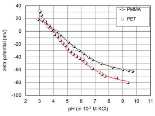 随着pH降低,惰性聚合物表面如聚甲基丙烯酸甲酯PMMA和聚对苯二甲酸乙二酯PET的负的zeta电位减小并且零电位点IEP在pH 4处。