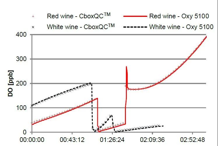 图 2 显示了在不同的 CO2 浓度下,含气葡萄酒的工艺和实验室数据相关性。在使用 N2 脱气的过程中,Carbo 5100 与实验室参考值 (CboxQCTM) 之间的偏差(< 11:45 的时候)是由于溶解 N2 含量相对较高造成的。实验室参考值和 Carbo 6300 的测量方法均不受溶解外来气体(如 O2 和 N2)的影响。图 3 显示了红葡萄酒和白葡萄酒中 DO 的工艺和实验室数据相关性。