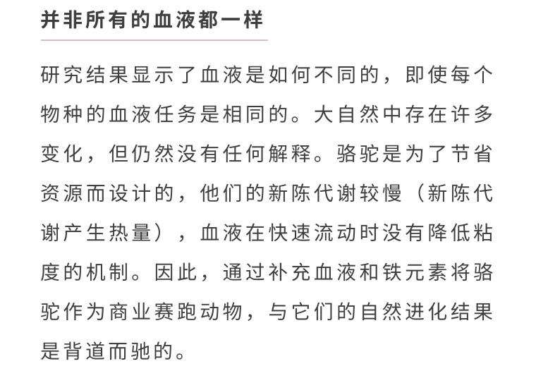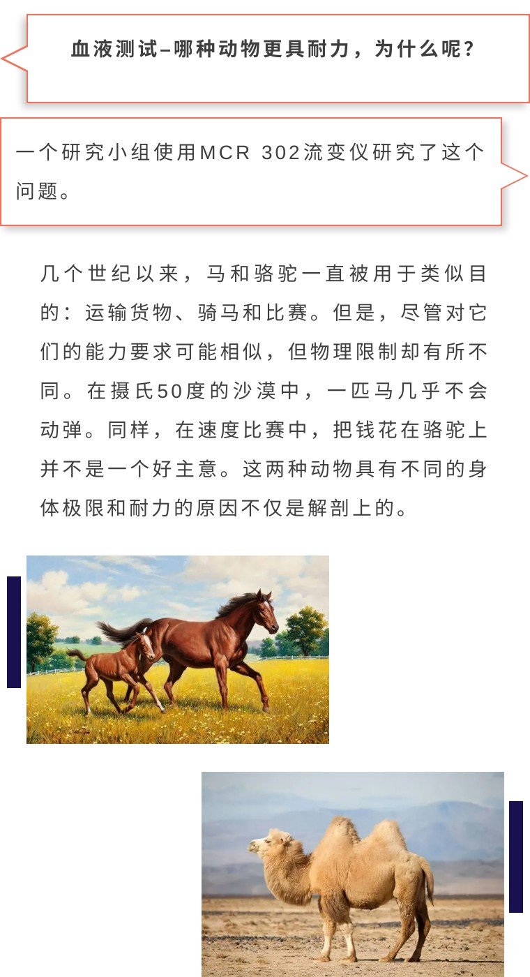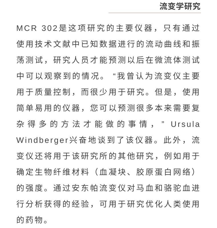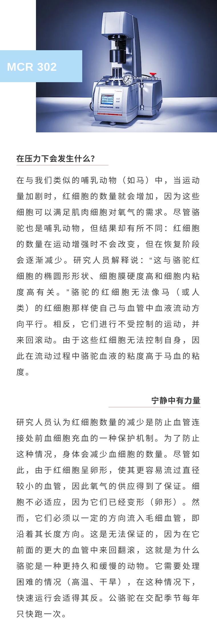 乌苏拉·温德伯格(Ursula Windberger)是维也纳医科大学的实验外科教授,确切地说在血液方面有深入研究。她与她的研究小组一起,使用安东帕(Anton Paar)的MCR 302流变仪,研究了迪拜骆驼繁殖场的十只单峰骆驼和维也纳的十匹纯种马的血液。她取得了惊人的结果,并发现了有趣的差异。