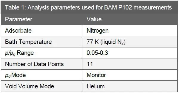 在测量BET比表面积时,样品的总表面积(m2)是获得准确和可重复性结果的关键。必须有足够的面积使氮气吸附,以产生仪器能够准确检测到的压力变化。使用标准样品BAM P102在安东帕Nova 800(长样品管)和Nova 600 BET(短样品管)上进行总表面积(m2)和重复性之间的相关性研究。在这两种仪器上,都使用了带有填充棒的9毫米大球泡样品管。表1给出了用于测量的分析参数。