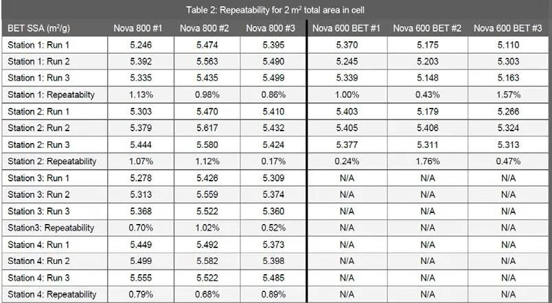 3台Nova 800和3台Nova 600 BET仪器的结果如表2所示。所有测试结果都符合BAM P102要求。结果发现,在所有6台仪器上,样品管的总表面积为2 m2时,重复性< 2%。对同一类型的不同仪器上的测试结果进行重现性计算,Nova 800和Nova 600 BET的重现性分别为1.77%和1.84%。