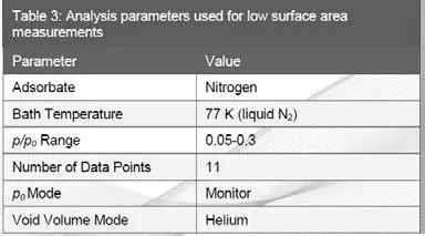 表 3 低表面积测量的分析参数