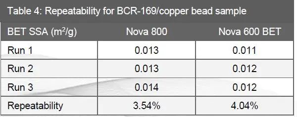 Nova 800 和Nova 600 BET 的结果如表4 所示。对于Nova 800,加入了27.9311 g(总表面积0.37 m2)的样品用于测量,对于Nova 600 BET,加入了30.7453 g(总表面积0.36 m2)的样品用于测量。所有测量结果的BET 相关系数都大于0.999。Nova 800 的重复性为3.54%,Nova 600 BET 的重复性为4.04%。三种测量方法的BET 表面积值仅变化0.001 m2/g,但由于整体表面积较低,即使是很小的差异也会导致重复性变大, 约3-4%。