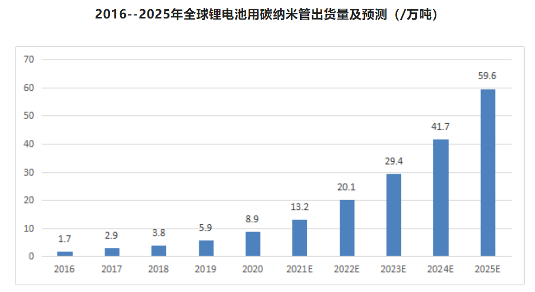 2019 年锂电导电剂领域 CNT 粉体需求约 1334 吨,按照 4%固含量测算对应 CNT 导电浆料需求量约 2.9万吨。预计至 2025 年锂电导电剂领域CNT 导电浆料需求量 约 59.6万吨,预计 2019-2025 年 CNT 导电剂需求 CAGR 约 50.2%。碳纳米管的应用会爆发式增长,单是在锂电池领域就会成为每年百亿级的市场。