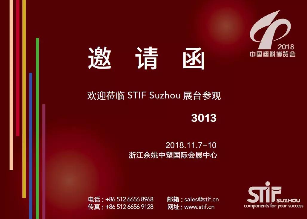 2018中国(余姚)国际塑料博览会暨第二十届中国塑料博览会于11月7-10日在浙江余姚中塑国际会展中心隆重举行,斯缇福机械(苏州)有限公司(股票代码:691677)邀请您参观“2018余姚塑料博览会”,展位号:3013。