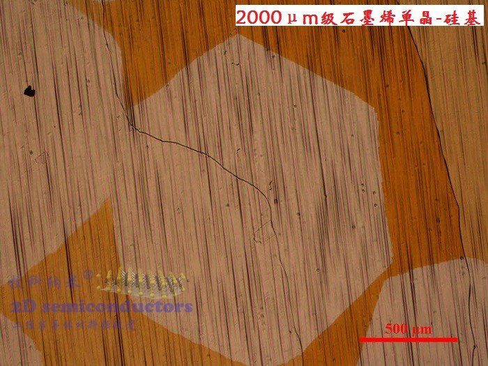 目前制备高质量石墨烯的方法,有胶带剥离法、碳化硅或金属表面外延生长法和化学气相沉积法(CVD),前两种方法效率低,不适于大量制备。而迄今由CVD法制备的石墨烯,一般是由纳米级到微米级尺寸的石墨烯晶畴拼接而成的多晶材料。 石墨烯优异的电、光、强度等众多优异性质使其在电子学、自旋电子学、光电子学、太阳能电池、传感器等领域有着重要的潜在应用,但大规模高质量制备技术是制约其进入实际应用的瓶颈之一。 牧科纳米技术团队经过长时间的技术攻关,不用昂贵的金属基体,在常见的铜衬底,以低浓度甲烷和高浓度氢气通过常压CVD法,成功制备出了100微米到几个毫米级六边形单晶石墨烯及其构成的石墨烯薄膜。而且可以转移到任意衬底上,方便取用。 该方法转移的单晶石墨烯具有很高的质量,将其转移到Si/SiO2基体上制成场效应晶体管,测量显示该单晶石墨烯室温下的载流子迁移率可达7100 cm2V-1s-1。 常见的铜基体上生长大尺寸单晶石墨烯及其薄膜技术的突破,为石墨烯基本物性的研究及其在高性能纳电子器件、透明导电薄膜等领域的实际应用奠定了材料基础。 石墨烯单晶表征数据: 2000um级别石墨烯单晶在铜衬底上的光学显微镜照片: