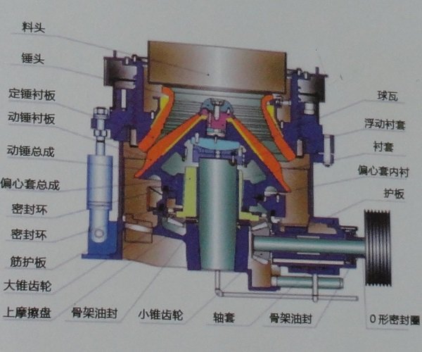 6、多种破碎腔型、应用灵活、适应性强,HP圆锥破碎机只须更换定锥衬板、动锥衬板,破碎腔形可从标准超粗腔型到短头超细腔型任意变换,适应大范围产品粒度要求。 7、维修简便、操作使用方便,HP圆锥破碎机所有零件都可以从顶部或侧面拆装和维护,动锥和定锥拆装方便,无需拆装机架、紧固螺栓,因而HP圆锥破碎机日常更换衬板更便捷。利用液压马达,使破碎机生产效率**。
