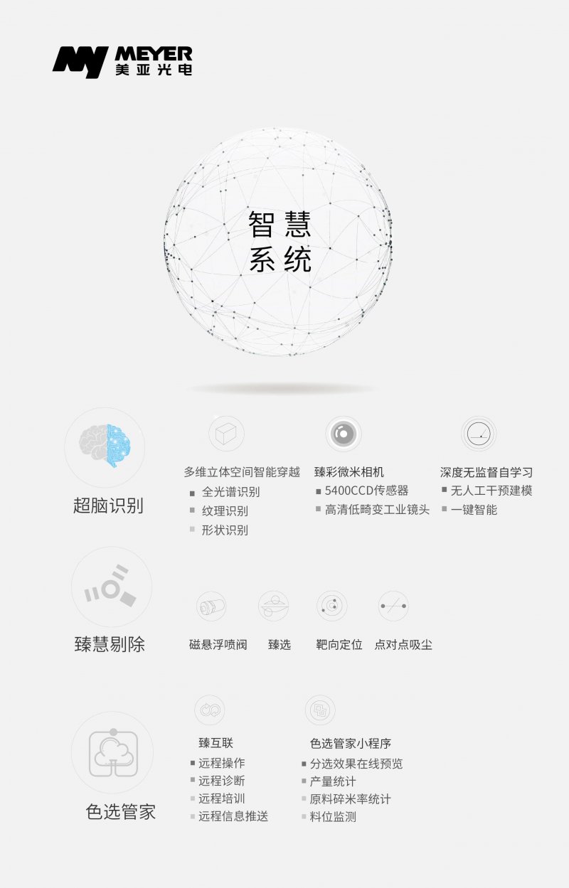 美亚LDS人工智能双层履带色选机,双层履带,上层分选,下层复选,多种选别方案灵活配置,大幅提高选别精度和生产效率。