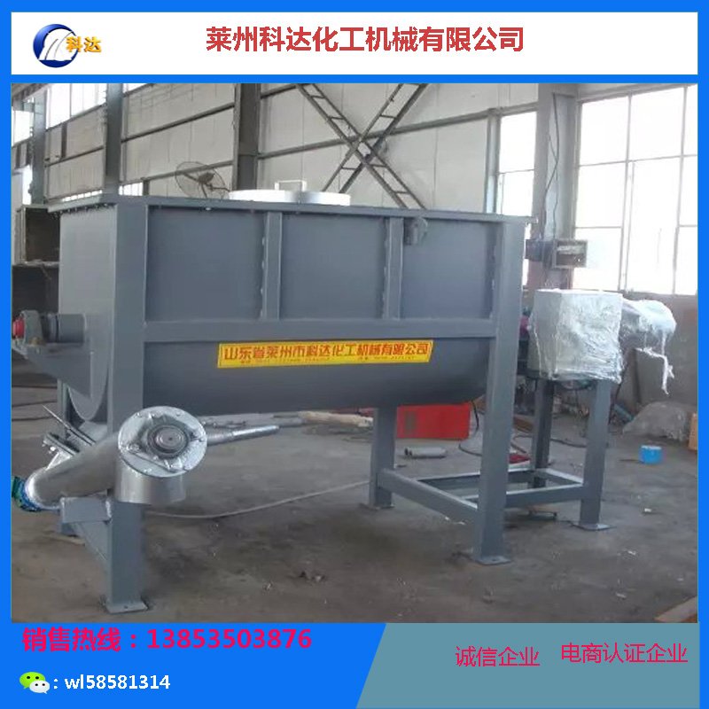 1、卧式螺带干粉混合机传动主轴上布置双层螺旋叶片,内部螺旋将物料远离出料口方向输送,外部螺旋将物料向出料口方向。物料在双层螺旋带的对流运动下,形成一个低动力高效的混合环境。