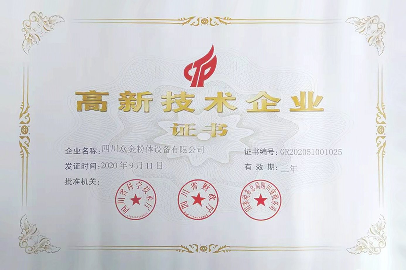 众金粉体喜获高新技术企业证书