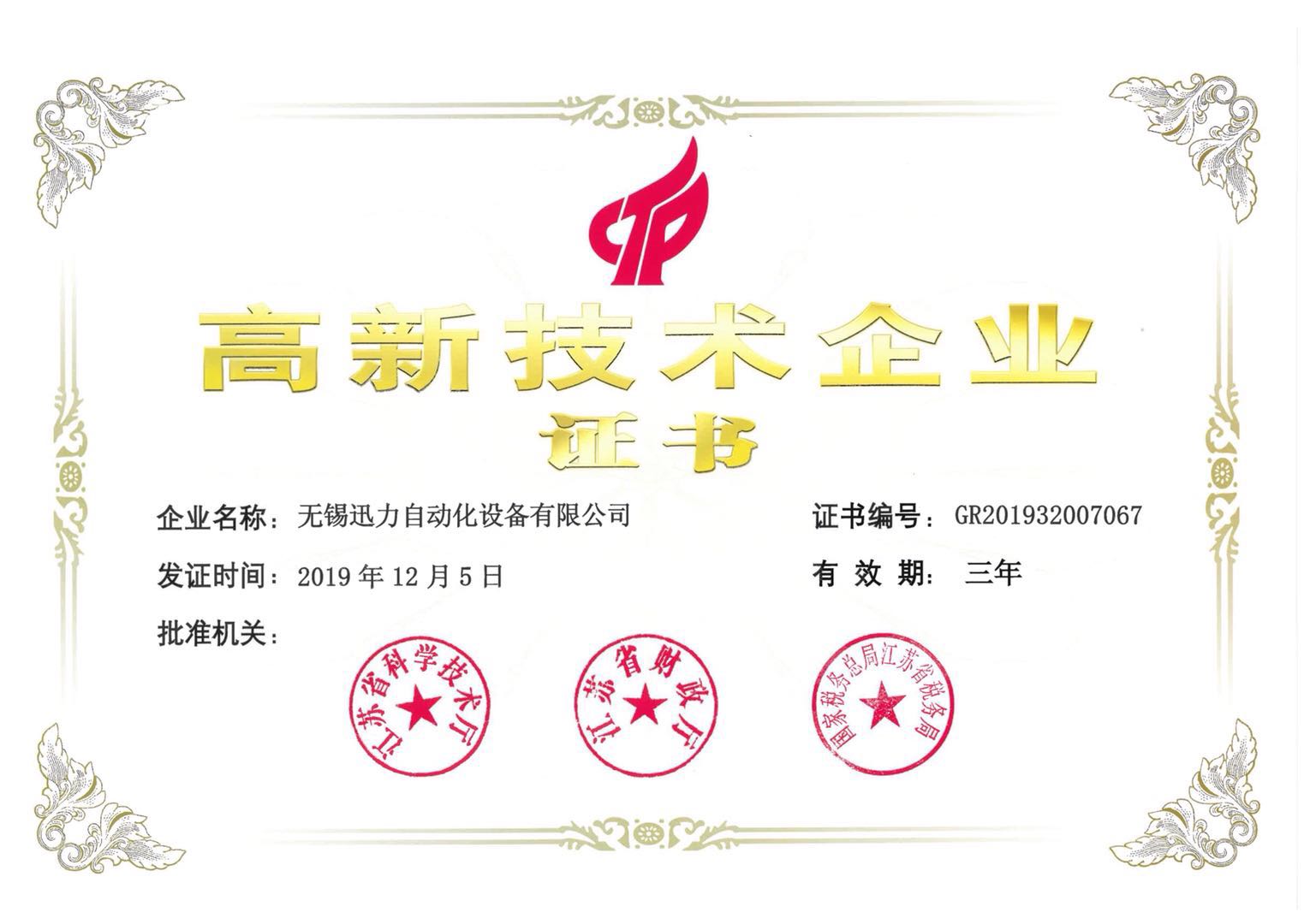 恭喜无锡迅力自动化设备有限公司正式成为高新技术企业!