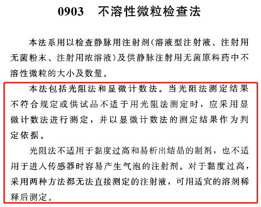 第一:当光阻法测定结果不符合规定或供试品 不适于用光阻法测定时,应采用显微计数法进行测 定,并以显微计数法的测定结果作为判定依据 。