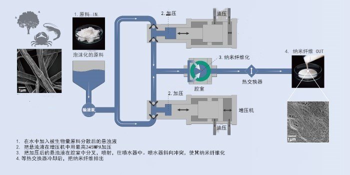 制浆的原料分散在水中并加压喷涂至245MPa。通过金刚石喷嘴相互倾斜碰撞,可以解决原材料并生产纳米纤维的问题。