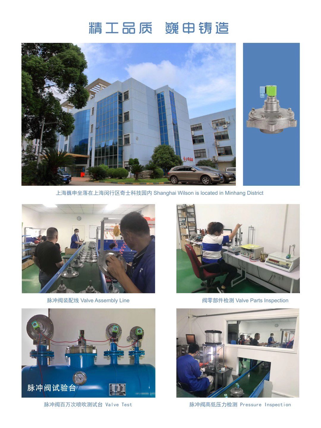 上海巍申环保科技有限公司 致力于环保除尘配件和粉尘颗粒生产过程产品的研发、生产和销售。公司汇集了一支十多年袋式除尘配件技术开发、产品生产、售前售后技术服务的精干团队。聘请国内外一流的技术专家,集国内外先进企业的管理经验,打造电磁脉冲阀及脉冲控制仪等袋式除尘配件及粉尘颗粒控制领域的名牌产品Swilson。