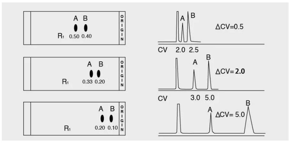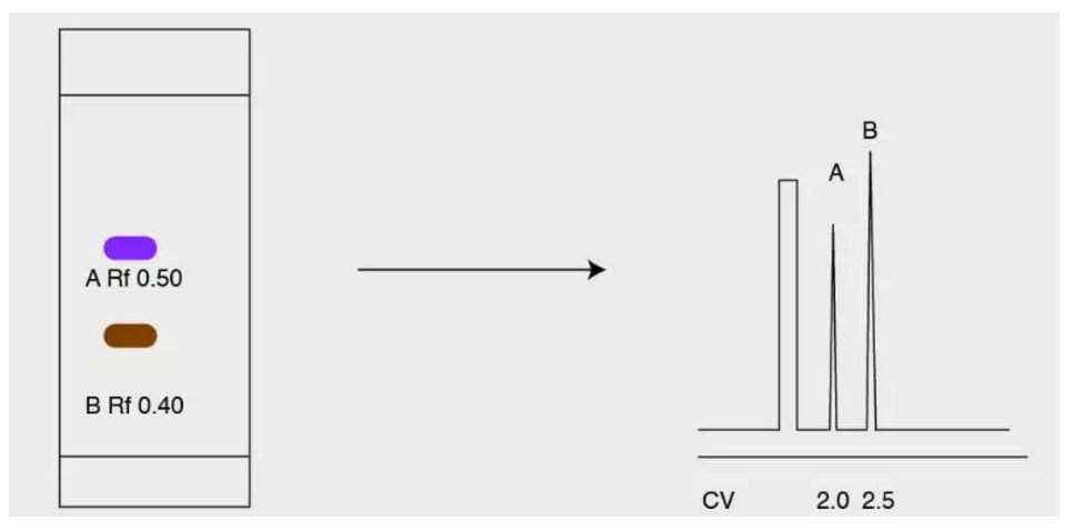 运行 TLC 分析后,有必要计算各个点的保留因子(Rf)。这可以通过一个简单的公式来完成: Rf = 分析物与原点的距离(b)/ 前沿与原点的距离(a) 其中:Rf=1 表示在 TLC 上没有保留(随着溶剂前沿向上移动),Rf=0 表示对溶剂没有亲和力(停留在起始线)。 由于保留因子和柱体积之间存在以下关系,因此可将TLC 开发的方法转移到 Flash 制备色谱当中: CV = 1/Rf 保留因子和柱体积之间的反比关系在实践中可以如下所示: