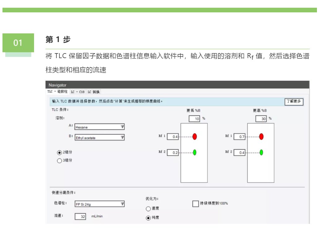 这些基本理论可以很容易地应用于特定的方法开发软件,例如 PURE 中压系统上的 Navigator,该程序可以将 TLC 数据转换为优化的 Flash 方法,以获得最佳的分离和纯化。 用户只需几个简单的步骤即可将 TLC 结果传输到软件中,并确定最适合其 Flash 快速纯化过程的参数。