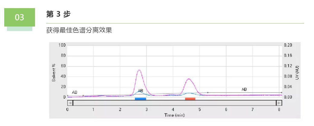 较小的 Rf 值会导致很长的运行时间和高溶剂消耗,而较大的 Rf 值会导致运行时间较短且存在不完全分离的风险,如下图所示。