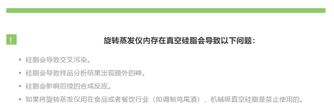 每当你进行旋转蒸发时,如果在旋塞上和玻璃接口处涂抹了真空硅脂,硅脂就会通过曝气时的回流或者从接收瓶和蒸发瓶转移液体时进入你的系统,影响样品的成分。市面上常见的真空硅脂往往是硅基润滑脂,这是一种非常容易溶解在有机溶剂中的物质。它会溶于非极性烃类溶剂的蒸汽,如戊烷、己烷、石油醚以及二氯甲烷,并且附着在玻璃内壁上。