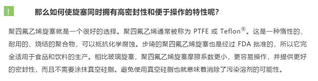 常规的市售玻璃旋塞通过表面的磨砂处理来填补玻璃件之间的缝隙,达到完全密封的效果。这样就导致旋塞旋转时阻力变大,如果强行旋转可能会出现断裂的情况。基于这种担忧,人们往往习惯涂抹真空硅脂来达到旋塞密封和润滑的效果,但这样就会出现上文所述的种种问题。