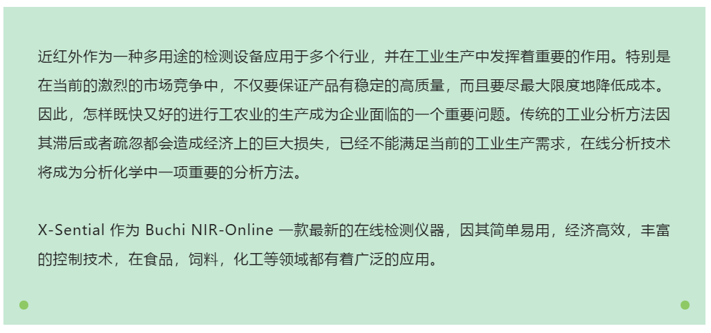 经济高效,平均投资回报不到一年: 在线近红外 NIR-Online X-Sential 的功能设计具有高适用性,因此非常经济高效。平均投资回报时间不到一年。无需商业校准数据库或大量的内部校准开发。可测定大量的原材料和成品的基本质量参数;这可以最大程度减少不良品产生和返工,并且便于实时纠偏。 丰富的过程控制技术以及工业化设计: 在线近红外 NIR-Online X-Sential 具有防尘、防水的主机探头外壳 (IP69/X9K)。使用温度稳定的光谱仪可以应对各种各样的环境和产品温度。X‑Sential 为快速、波动或者不连续的产品流动提供整体解决方案。集成到过程控制体系也简单方便。