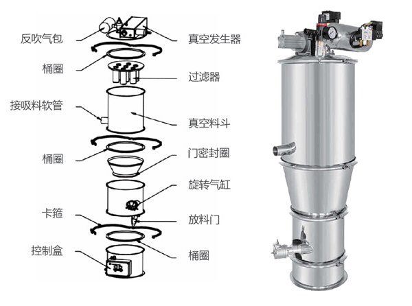 气动式真空上料机是利用压缩空气通过真空发生器产生高真空实现对物料的输送,不需要机械式真空泵,具有结构简单、体积小、免维修、噪音低、控制方便、消除物料静电和符合GMP要求等优点。真空发生器产生的高真空,使被输送的物料杜绝了分层现象,保证了混合物料成份的均一性,是压片机、胶囊填充机、干法制粒机、包装机、粉碎机、振动筛等机械自动上料的首选设备。