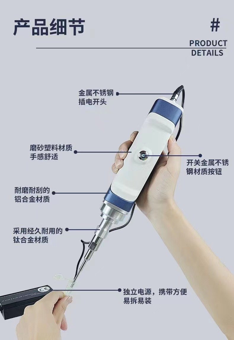 3、机身材料选用的优质的铝模搭配注塑模这样的结构方式,这样既保证了机器的牢固性和金属质感又能体现整机的轻便和时尚,变幅杆采用钛合金材料制作,具有强度高、声速高,耐蚀性好、耐热性高等特点,从而延长仪器的使用寿命;